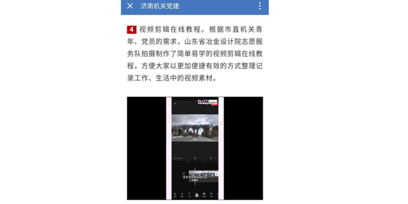 41日,為貫徹市直機關(guān)青年志愿“區(qū)塊鏈”項目部署,公司團委積極組建青年志愿服務(wù)隊,結(jié)合市直機關(guān)廣大黨員、青年掌握簡易視頻剪輯的需要,第三團支部、第六團支部團員青年迅速行動制作了電腦端視頻剪輯教程和手機端視頻剪輯教程,該志愿服務(wù)項目得到了市直機關(guān)團工委充分認可,并在濟南機關(guān)黨建平臺予以推廣。