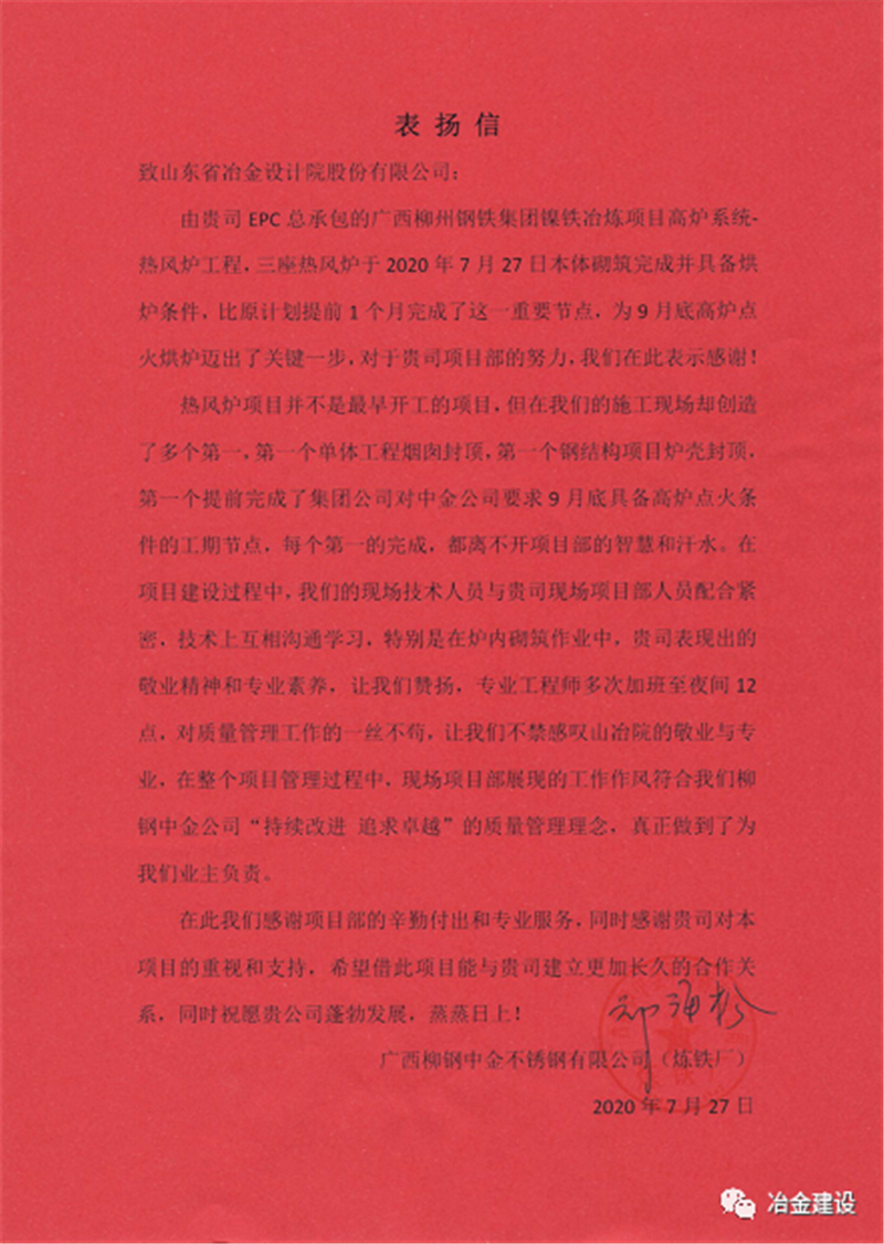 就是憑著這股韌勁和山冶設(shè)計(jì)“敢打硬仗、一切為用戶著想”的精神,柳鋼中金熱風(fēng)爐工程的各項(xiàng)工作推進(jìn)順利,并多次在安全、質(zhì)量、進(jìn)度大例會(huì)上受到表?yè)P(yáng)。在27日砌筑封頂之后,上午柳鋼中金煉鐵廠送來表?yè)P(yáng)信,對(duì)現(xiàn)場(chǎng)項(xiàng)目部的工作給予了肯定,下午柳鋼中金公司副總經(jīng)理張洪波授予了現(xiàn)場(chǎng)項(xiàng)目部專業(yè)設(shè)計(jì)精心施工的錦旗,盛贊山冶設(shè)計(jì)專業(yè)、敬業(yè)!