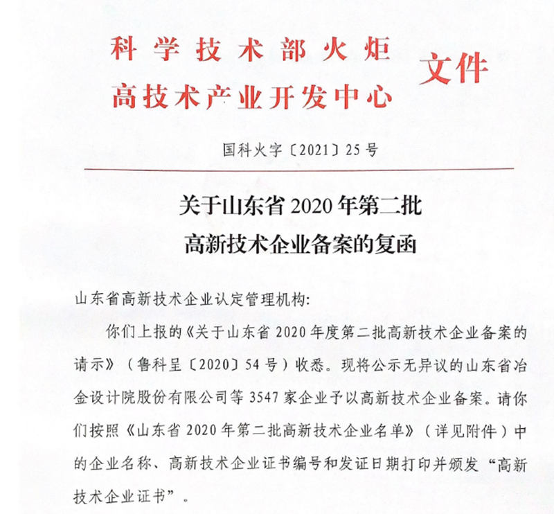 1月15日,根據(jù)全國(guó)高新技術(shù)企業(yè)認(rèn)定管理工作領(lǐng)導(dǎo)小組辦公室印發(fā)的《關(guān)于山東省2020年第二批高新技術(shù)企業(yè)備案的復(fù)函》,公司順利通過(guò)了2020年度國(guó)家高新技術(shù)企業(yè)認(rèn)定。