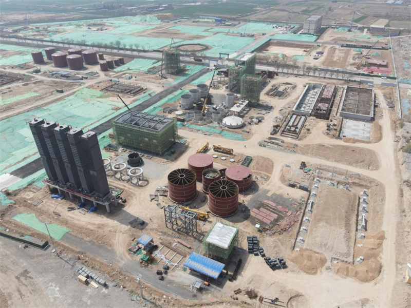 煤氣凈化區(qū)域的鼓風(fēng)機(jī)站、蒸氨框架、脫氨廠房土建結(jié)構(gòu)已經(jīng)封頂,循環(huán)水泵房以及集水池已經(jīng)完成澆筑,油庫區(qū)、焦油氨水分離區(qū)域的罐體逐步封頂,初冷器設(shè)備安裝完成,脫硫、終冷洗苯以及電捕等主要設(shè)備的安裝以及埋地管道的施工已在進(jìn)行中。