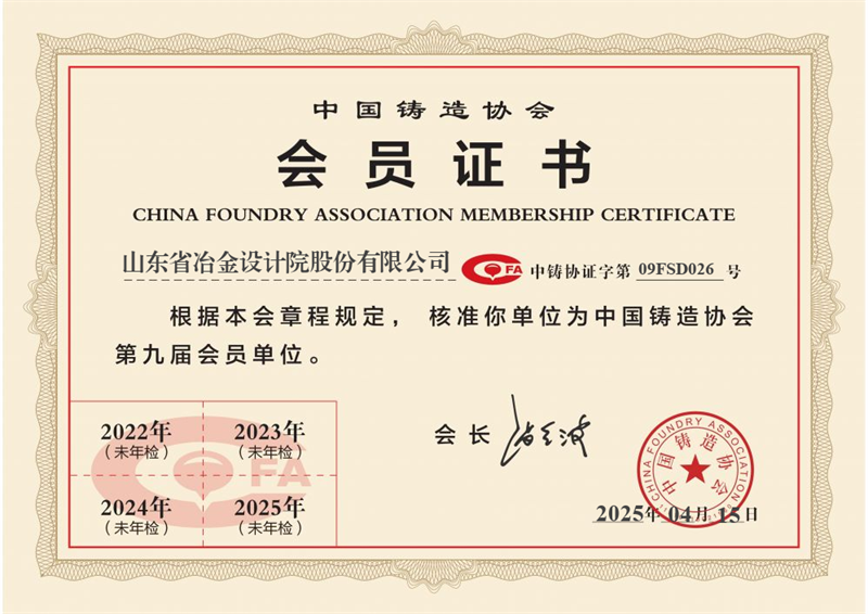 山冶設(shè)計成功加入中國鑄造協(xié)會