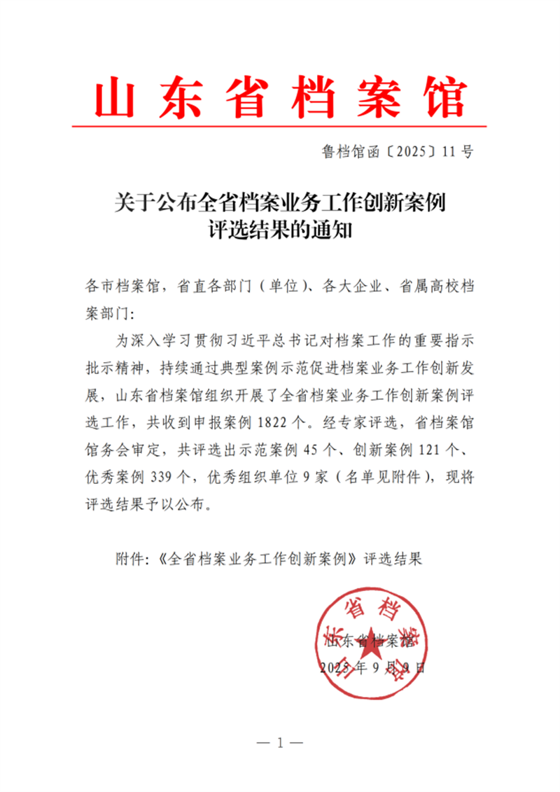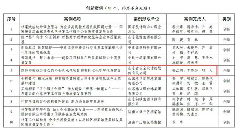 9月9日,山東省檔案館發(fā)布《關(guān)于公布全省檔案業(yè)務(wù)工作創(chuàng)新案例評(píng)選結(jié)果的通知》。其中,山冶設(shè)計(jì)申報(bào)的《以經(jīng)濟(jì)效益為核心的冶金總承包項(xiàng)目檔案標(biāo)準(zhǔn)化管理體系建設(shè)》入選“檔案服務(wù)企業(yè)高質(zhì)量發(fā)展案例”創(chuàng)新案例。此案例深入總結(jié)了山冶設(shè)計(jì)在開(kāi)展總承包工程近二十年間,幾代山冶檔案人關(guān)于總承包檔案管理的經(jīng)驗(yàn),并結(jié)合公司發(fā)展需求,初步構(gòu)建起“以經(jīng)濟(jì)效益為核心的冶金總承包項(xiàng)目檔案標(biāo)準(zhǔn)化管理體系”。
