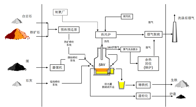 HIsmelt是一種直接熔融還原的煉鐵工藝,是典型的一步法熔融還原工藝。該工藝可直接熔煉經(jīng)預熱處理的鐵礦粉和其他適合的含鐵原料,并噴吹煤粉作為系統(tǒng)的還原剤及熱量來源。HIsmelt工藝流程圖如下: